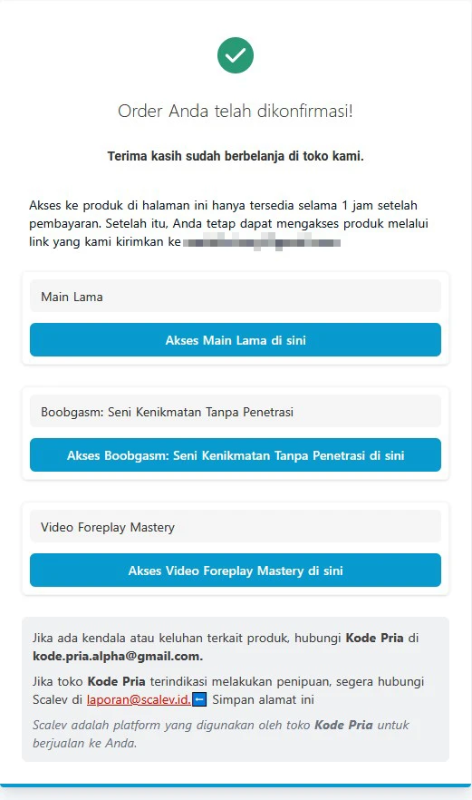 Akses produk akan dikirim instant ke email masbro setelah pembayaran terkonfirmasi (pembayaran pakai QRIS dan Virtual Account), dan terkirim otomatis dalam 15-20 menit untuk pembayaran melalui transfer BCA.